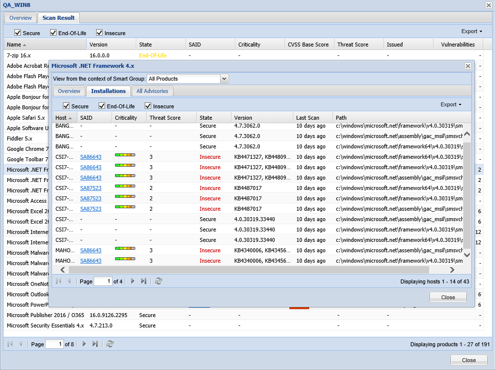 When the user double clicks the product and selects the Installations tab, all the installations of that product get appear along with their Threat Score.