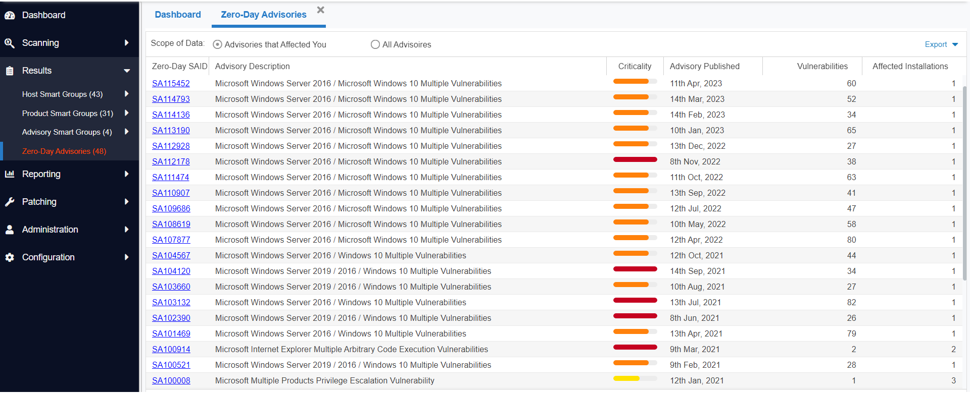 The Threat Score appears in the Zero Day Advisories page. Selecting the All Advisories option displays the list of all the zero day advisories while selecting the Advisories that Affected You option displays only the list of all the current and historic zero day advisories that have affected you. The list of advisories seen here may vary from the list in the Smart Groups under the Results section.
