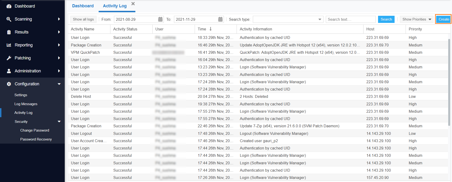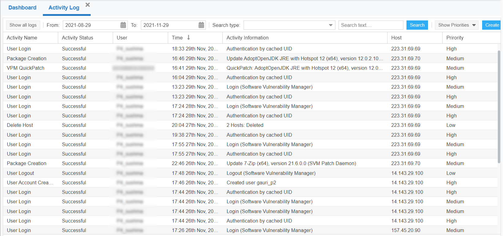 Use this page to view information about user activity within Software Vulnerability Manager, for example “write” actions, logins, and so on, with the exception of scans (due to the volume of data generated). You can access a full activity and login log for compliance monitoring and auditing purposes.