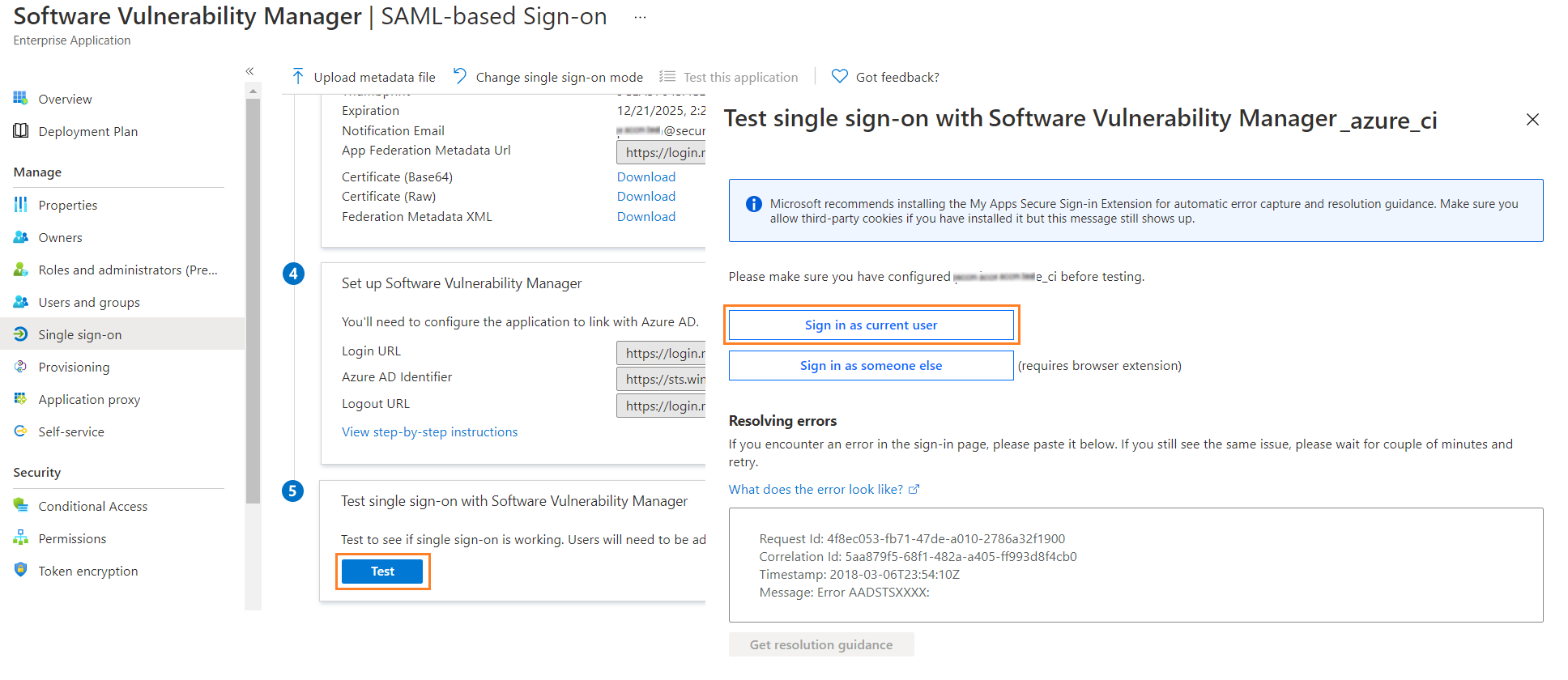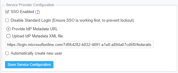 The Set up Single Sign-On with SAML page appears. Under SAML Signing Certificate field copy Metadata Url, login to Software Vulnerability Manager, browse Configuration > Settings > Service Provider Configuration, and then check SSO Enabled. Paste the copied URL into the text box.