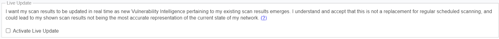 Select the Activate Live Update check box to update your scan results as new Vulnerability Intelligence pertaining to your existing scan results emerges. By doing this you agree that you understand and accept that this is not a replacement for regular scheduled scanning, and could lead to your shown scan results not being the most accurate representation of the current state of your network. Live Update changes will only modify scan data received after enabling this feature. Older scan results will not be affected by this feature. Please note that Live Update does not update Red Hat Agent scan results.