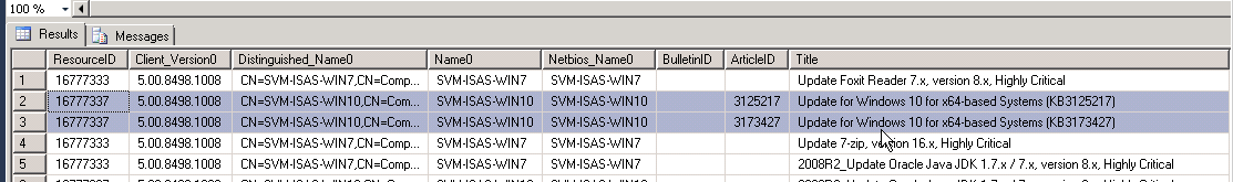 SELECT v_Update_ComplianceStatusAll.ResourceID, Client_Version0, Distinguished_Name0, Name0, Netbios_Name0, BulletinID, ArticleID, Title
