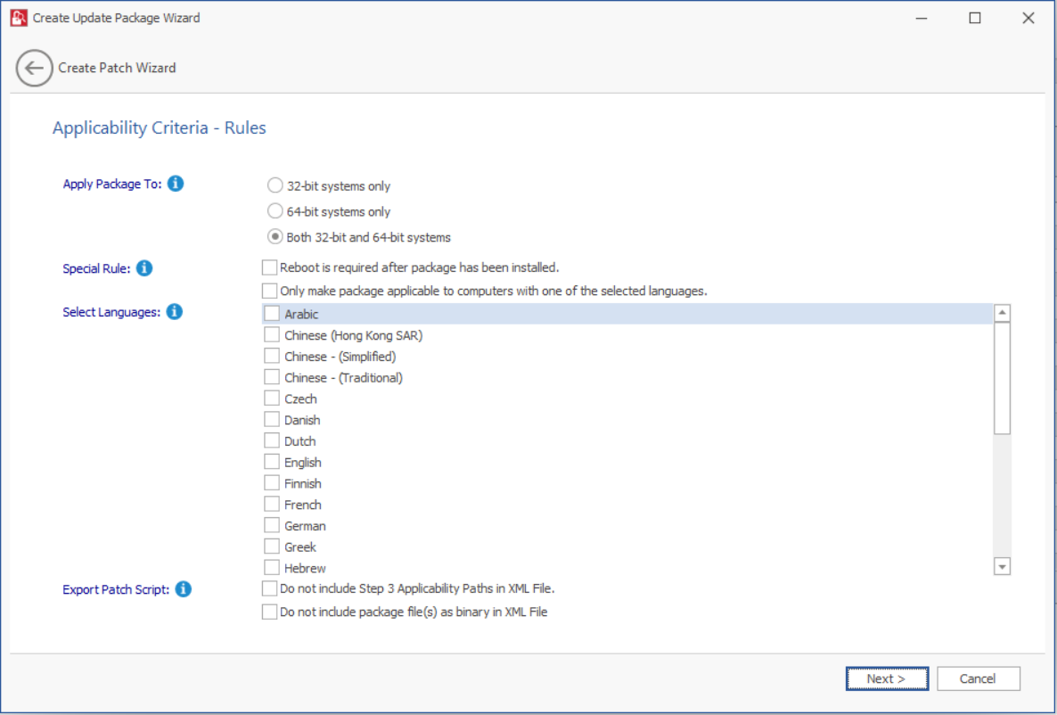 | Export Patch Script | The two options (Do not include Step 3 Applicability Paths in XML File and Do not include the package file(s) as binary in XML File) are taken into consideration only when exporting the package to the File System (Export), otherwise the selection will be disregarded. |
