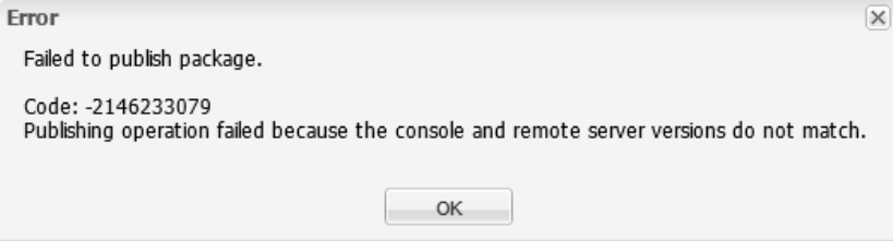 When the WSUS Server and Software Vulnerability Manager are installed on different machines, they must be on the same patch level for the WSUS Administrator Console API on the Software Vulnerability Manager console plug-in host to work. If they are not on the same patch level, the Software Vulnerability Manager console plug-in host will not publish packages to the WSUS server, and you will receive the following error message:
