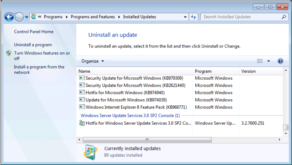You should ensure that the same KB articles are installed on both the WSUS Sever and the Software Vulnerability Manager console plug-in host. To find the WSUS updates that have been installed, navigate to Programs and Features (Add/Remove Programs) in the bottom of the list of Installed Updates.