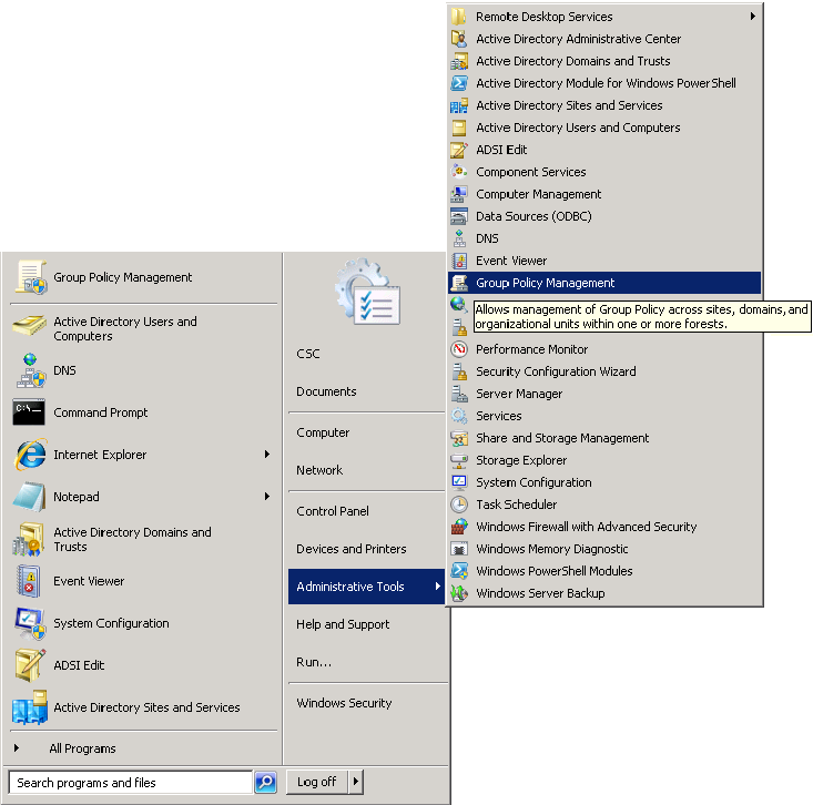On the Domain Controller, click Start > Administrative Tools > Group Policy Management. Right-click your Domain name and select Create a GPO in this domain, and Link it here. Alternatively you can edit an existing GPO.
