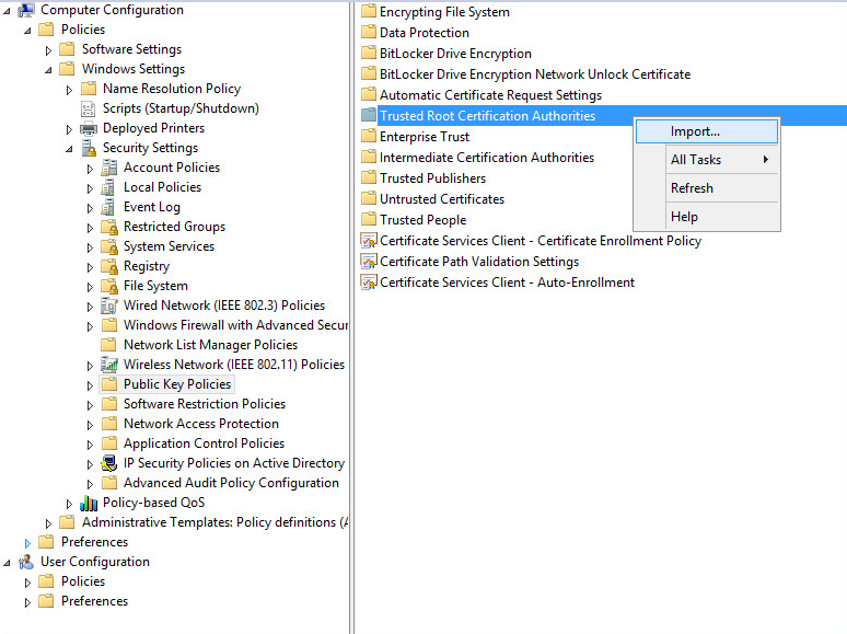 Right-click Trusted Root Certification Authority and select Import. Import the certificate that you exported in Step 1.