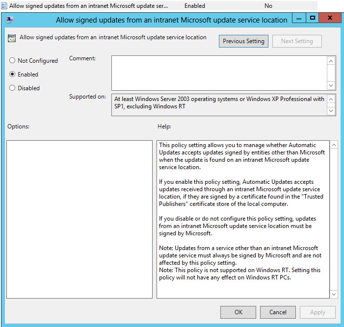 On the right side menu, double-click Allow signed updates from an intranet Microsoft update service location. Select Enabled and click OK.