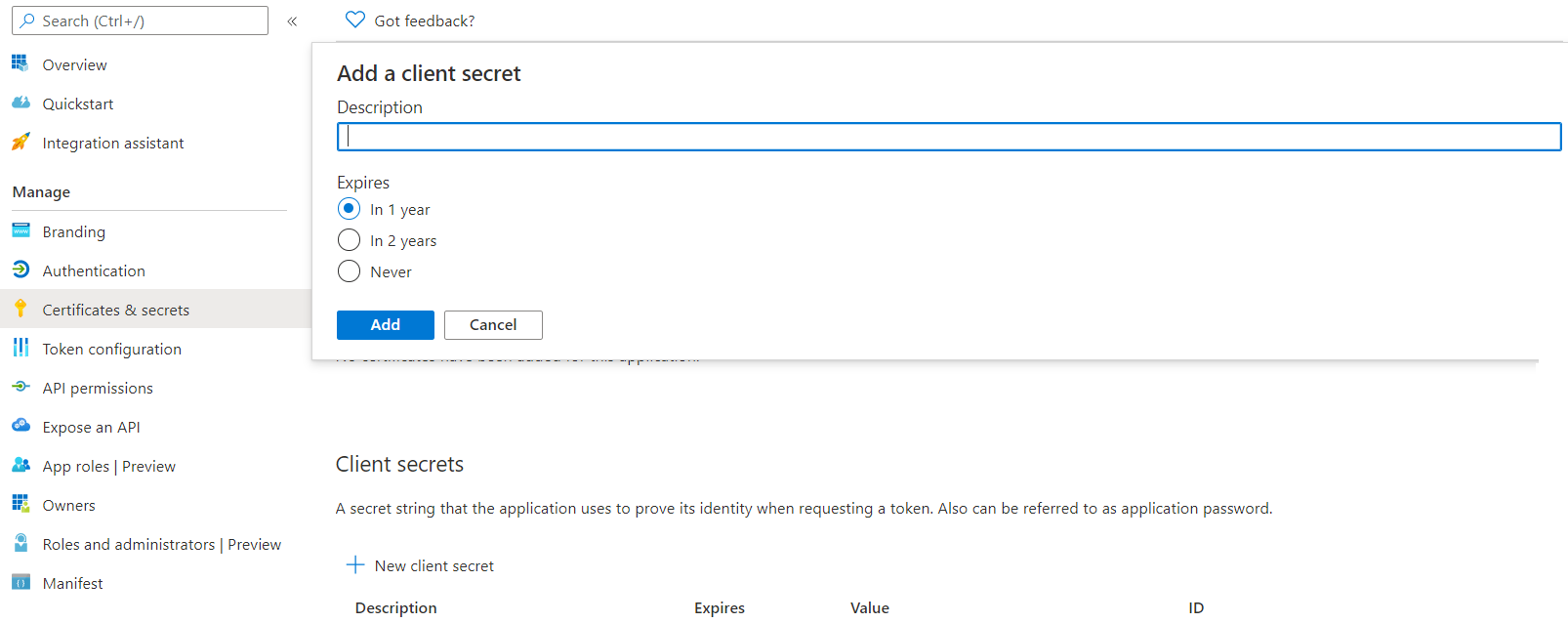Provide a description to describe your client secret, choose the expiration date you wish to set, and then click Add. The Client secret will then be listed in the Client Secrets section.