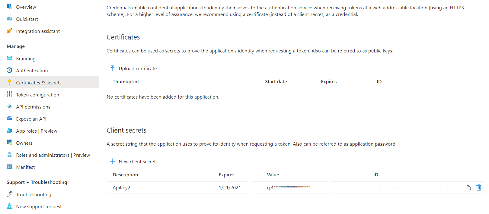 On the application account details page, select Certificates & secrets from the left panel.
