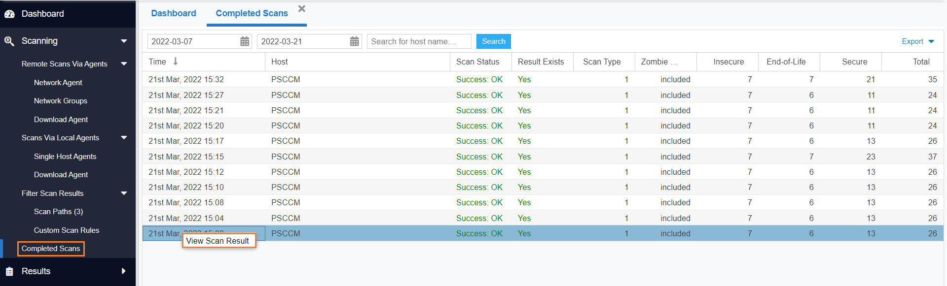 Use this page to view a summary of the scans conducted. Double-click an entry for further details or right-click and select View Scan Result.