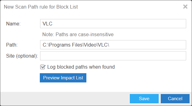 Use this feature to create either an allow list or Block list of paths/locations to restrict the locations inspected by the Software Vulnerability Manager scan.