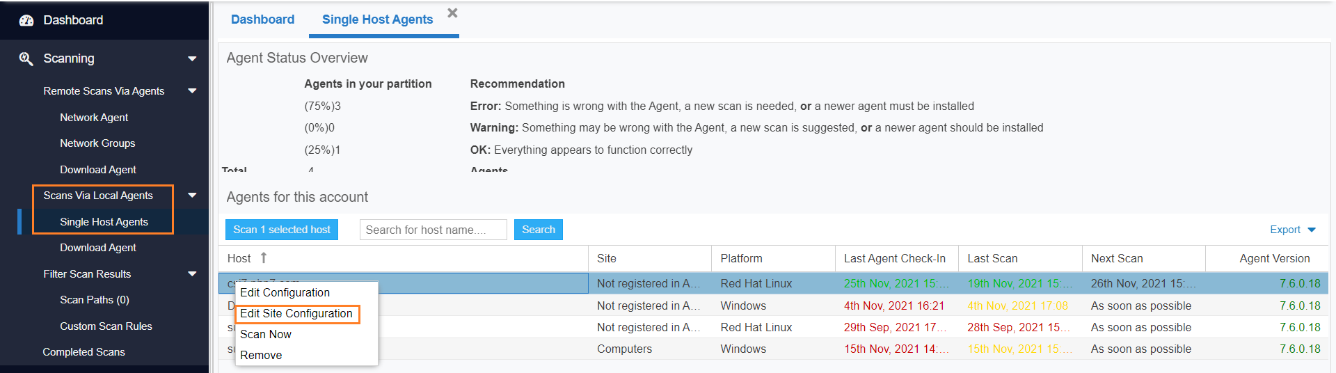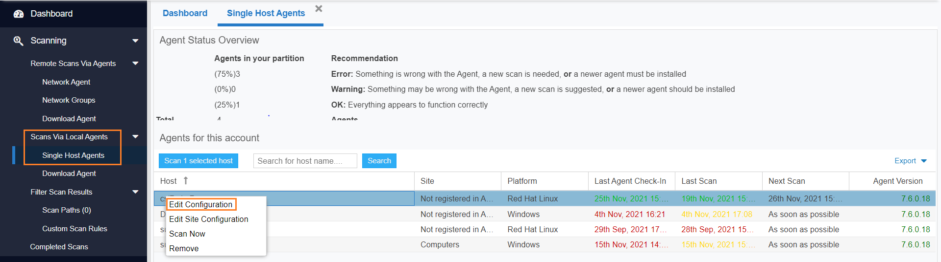 Manage configurations and schedule scans for the hosts where the Agent is installed as a service in Single Host mode.