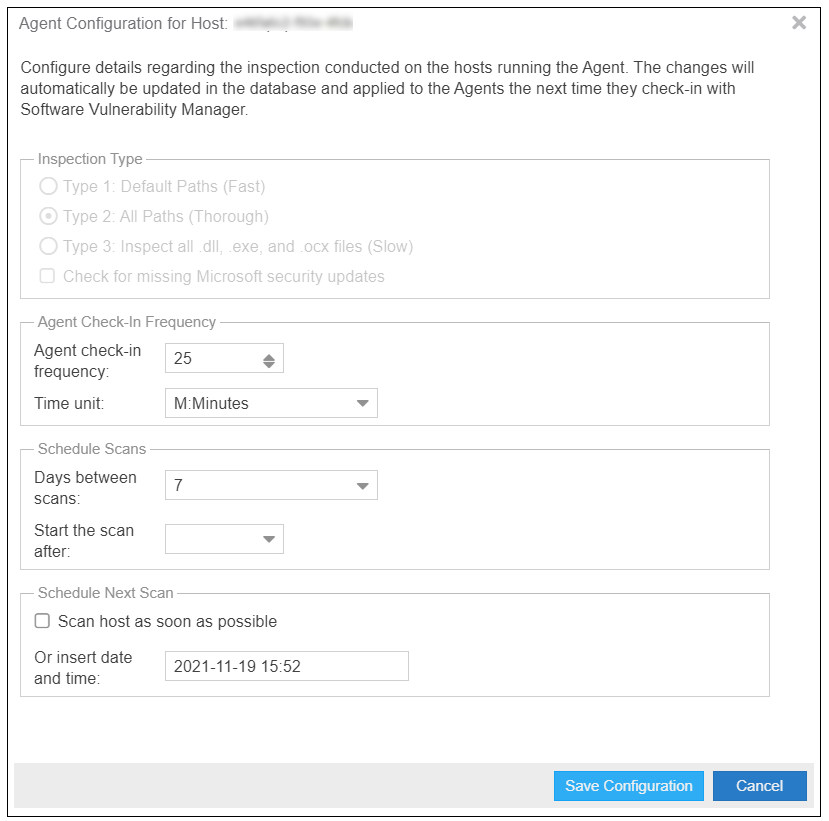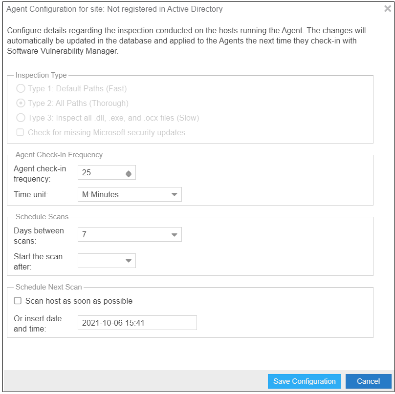 The scan configuration settings set on the Software Vulnerability Manager website are not automatically transmitted to the agents. The agents have to connect to the Software Vulnerability Manager website as per their prior scheduled Agent Check-In Frequency before the agents become aware of the new scan configuration edits.