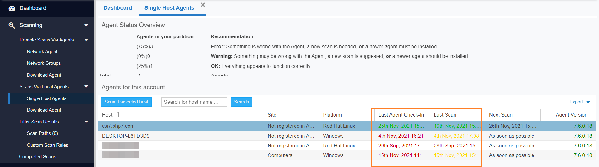 Any edits made to the Agent Check-In Frequency option or selecting the Schedule Next Scan option Scan host as soon as possible will come into effect only after an agent has checked in as per the previously set scan frequency.