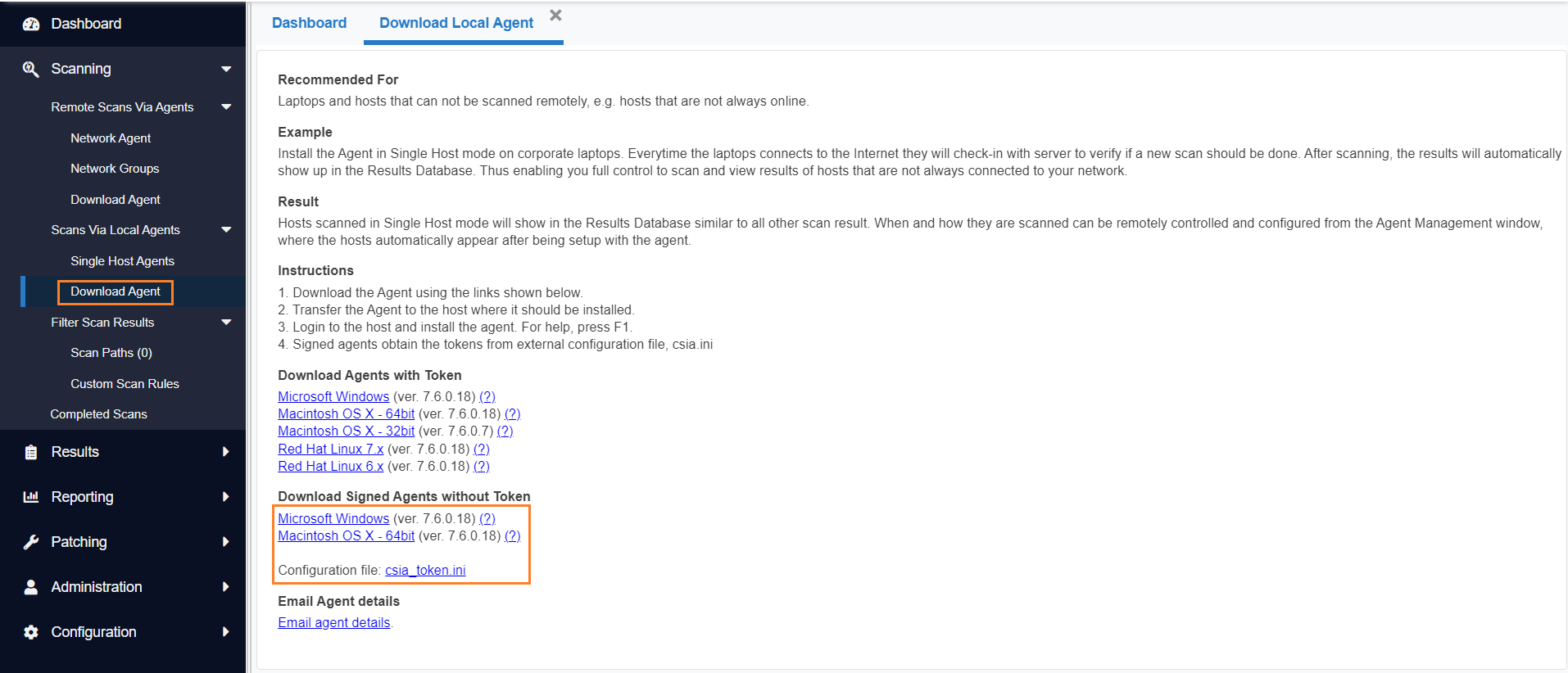 In Scanning > Scanning Via Local Agents > Download Agent, download the disk image and csia_token.ini.