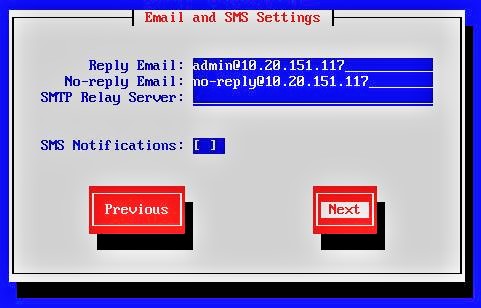 Software Vulnerability Manager (On‑Premises Edition) Virtual Appliance Installation GuideInstalling Software Vulnerability Manager Oracle LinuxEmail and SMS SettingsEmail and SMS Settings Enter the Email and SMS notification details and click Next.