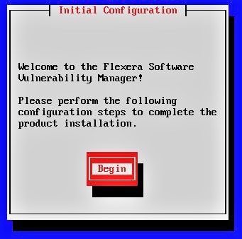 The Initial Configuration screen will appear. Click Begin to start configuring the Software Vulnerability Manager 2019 Virtual Appliance for the following.